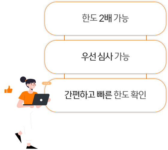 • STEP.04 결과확인 : 대출승인 여부, 한도 및 금리, 준비 서류 등을 안내합니다.