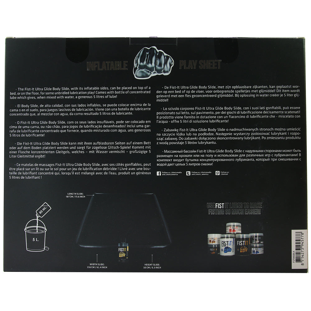 In soft black vinyl, Play Sheet features inflatable sides for an shield against splash-back from massage, lube and otherwise. A bottle of extra concentrated Fist It lube is included, dilute with water for a full 5 liters of slipperiness to roll around in.